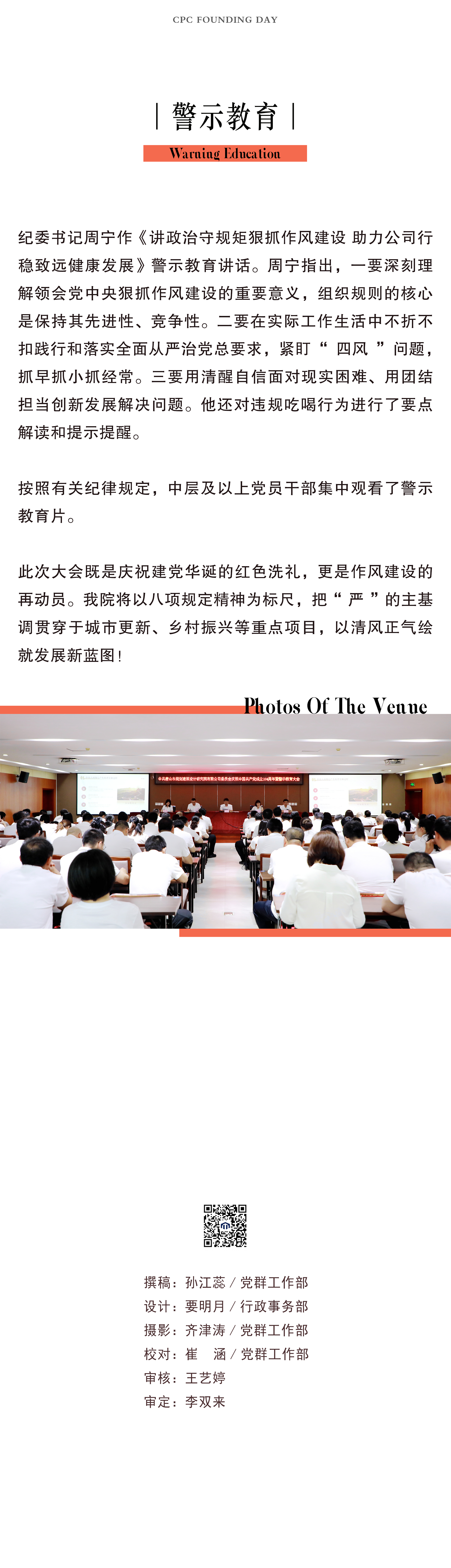【概要描述】7月1日上午,院黨委組織召開(kāi)慶祝中國(guó)共產(chǎn)黨成立104周年暨警示教育大會(huì)。黨委書(shū)記、董事長(zhǎng)李雙來(lái)同志以《深入貫徹中央八項(xiàng)規(guī)定精神 扎實(shí)推進(jìn)學(xué)習(xí)教育開(kāi)展 以優(yōu)良作風(fēng)賦能企業(yè)高質(zhì)量轉(zhuǎn)型發(fā)展》為題講授專題黨課,紀(jì)委書(shū)記周寧同志通過(guò)典型案例剖析并結(jié)合公司實(shí)際進(jìn)行警示教育講話。公司領(lǐng)導(dǎo)班子、總監(jiān)及副總監(jiān)、中層干部、全體黨員共計(jì)160余人參會(huì)。會(huì)議由黨委副書(shū)記王藝婷主持。